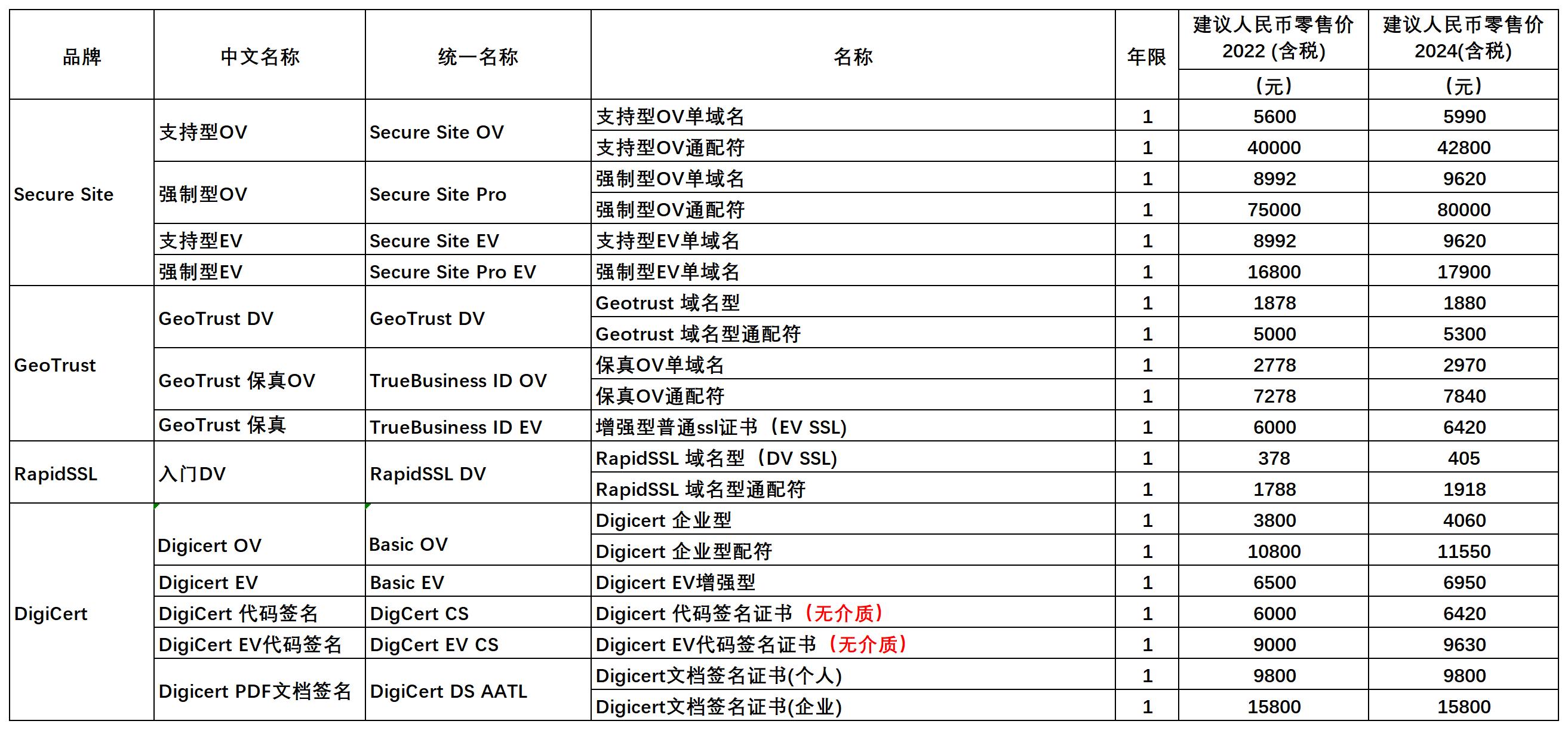 收到DigiCert品牌廠商關(guān)于SSL證書價(jià)格調(diào)整的通知,中萬網(wǎng)絡(luò)將于北京時(shí)間2024年06月10日起調(diào)整中國內(nèi)地DigiCert全系列品牌下所有SSL證書的售價(jià)。本次建議調(diào)整價(jià)格如下圖所示,具體調(diào)整情況,請(qǐng)以證書服務(wù)購買頁為準(zhǔn)。